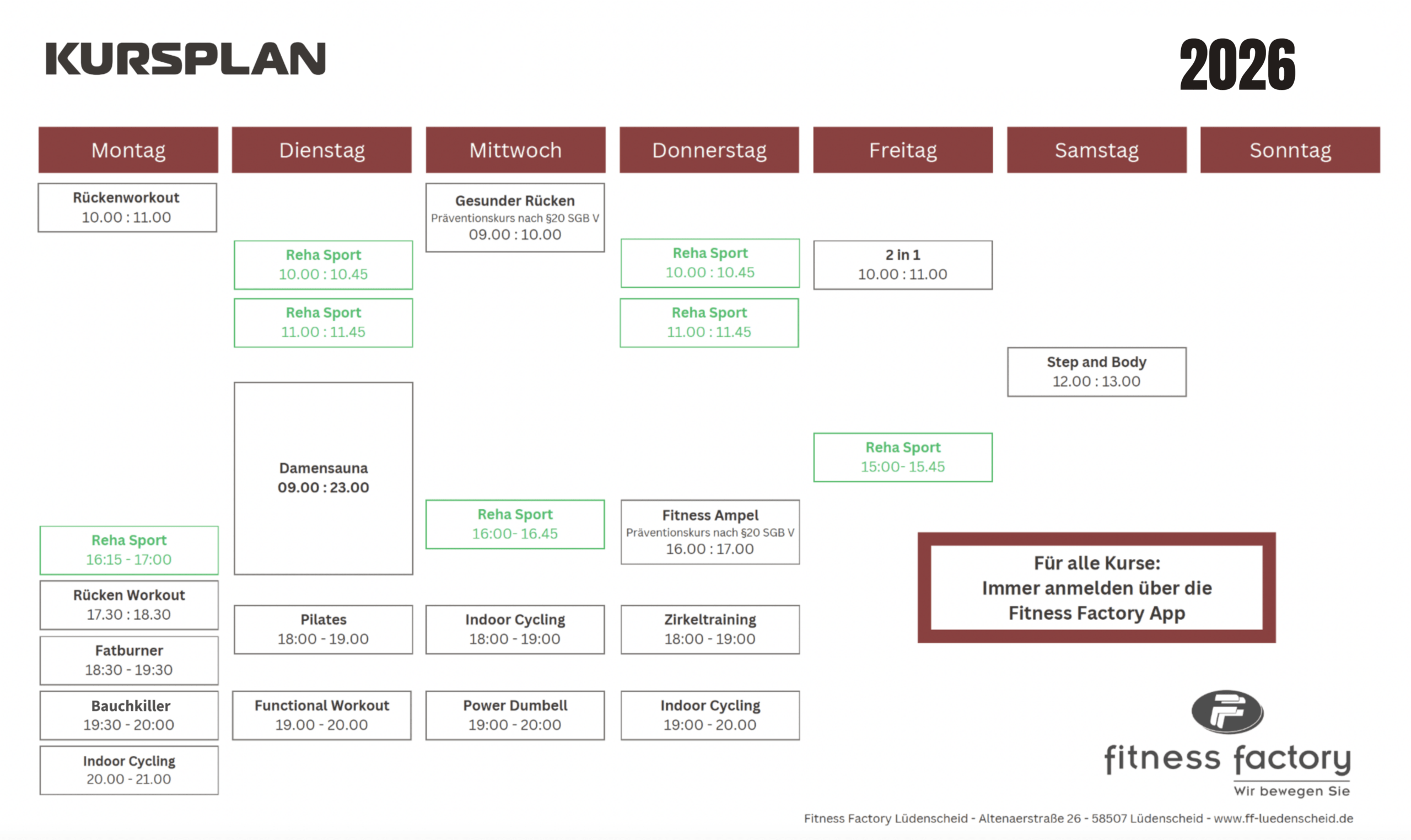Wir bieten Ihnen ein umfangreiches und vielseitiges Kursprogramm. Kurse wie Schwinn Cycling, Functional Workout, Rückenworkout, Aerobic und noch viele mehr. Es ist für jeden Geschmack etwas dabei. 120 qm Kursraum mit modernster Soundanlage sorgen für Spaß und Bewegung.